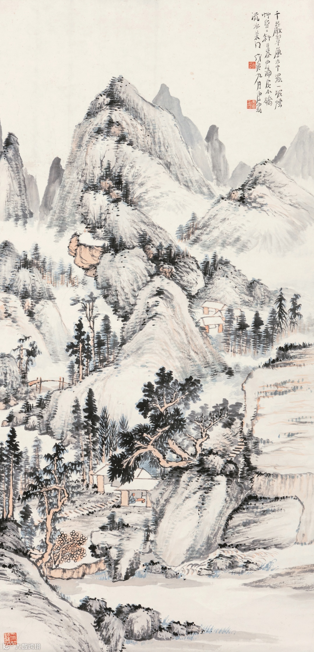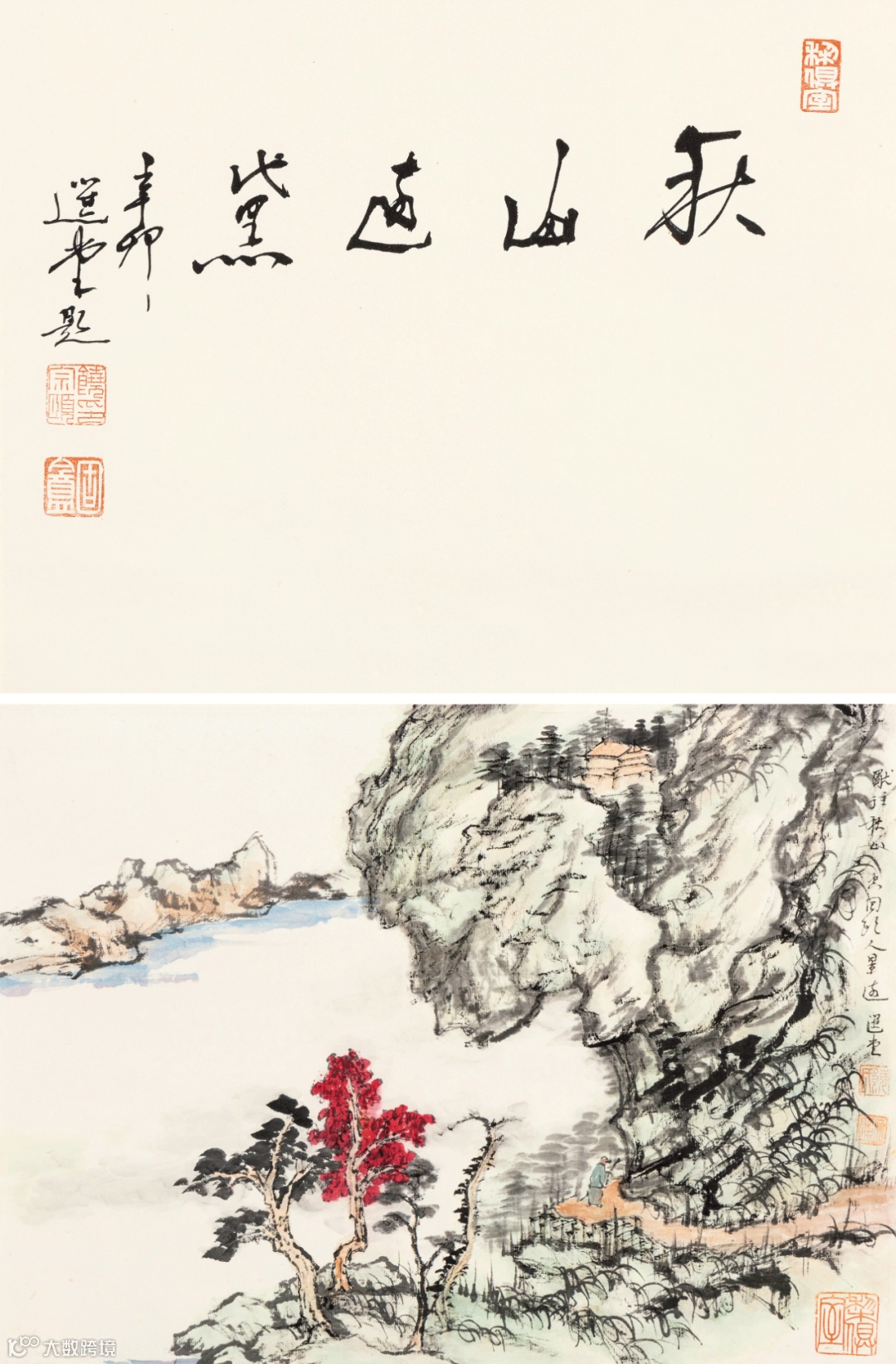 3.陆俨翁受业冯超然,终以山水画甲南北。其造诣远在师尊同门之上,实则陆画用笔以石涛、董香光、王蒙为依归,而自创峻峭奇崛之笔致,深得山之脉理,又曾多年体验蜀中山水,尝见其写长江之峡,惊涛拍岸,卷起千堆雪,叹为观止。明清五百年前来无此妙制,至其以丹砂点树染石草木,虽从黄鹤化出,而尤以表现林林总总,浓淡相见之橘柚,别是一番新意。陆画虽秉承南宗衣钵,而写蜀中山石栈道,又以黄鹤抖战曲屈之笔势,杂以北宗李唐江山小景之斧劈,可谓合李、王两家笔法于一室。陆俨翁不独画艺精绝,文笔亦属当代翘楚,其诗老杜,文宗韩柳,俱臻佳妙。书法则略效东坡,而成自成之体,盖意在东坡之神,不在东坡之形,因而下笔轻重自如、左右逢源。此图亦写雁荡,仍以北宗横括小斧劈为全画主导,以侧峰拖笔,以写山石轮廓,别又一番风味矣,健碧再题。陆俨翁画以云水称最,昔日同蜀乘槎东归江南,画格峡江险水之妙。此写雁荡奇景,山石之外,仍以云水独步神州矣。戊寅冬十二月,健碧题于巨鹿园。