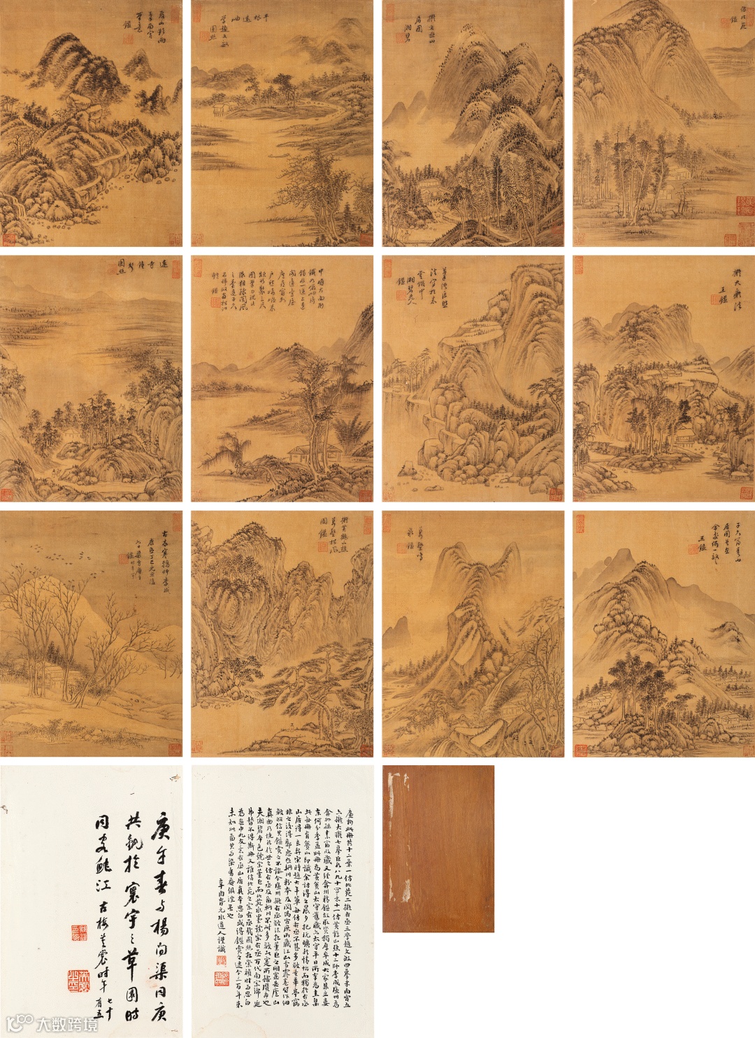 款识:1.仿北苑。鉴。2.拟右丞山居图。湘碧。3.平林远岫。学赵文敏,圆照。4.夏山欲雨。摹南宫笔意。鉴。5.拟大痴法。王鉴。6.摹僧巨然法,写于来云馆中。湘碧老人鉴。7.中峰大面削铁如,岩岫绮错非一途。上连阁道旁屋庐,寻窗数户愁崎岖。米颠所制三尺图,笔力视此微粗疏。阆风之台迟子久,不归政为松江鲈。鉴。8.远寺锺声。圆照。9.子久富春山居图曾在余处,偶一效之。王鉴。10.万壑鸣泉。鉴。11.拟黄鹤山樵万壑松风图。鉴。12.古木寒鸦,师李成。康熙丁巳元旦后六日,染香庵主鉴时年八十。