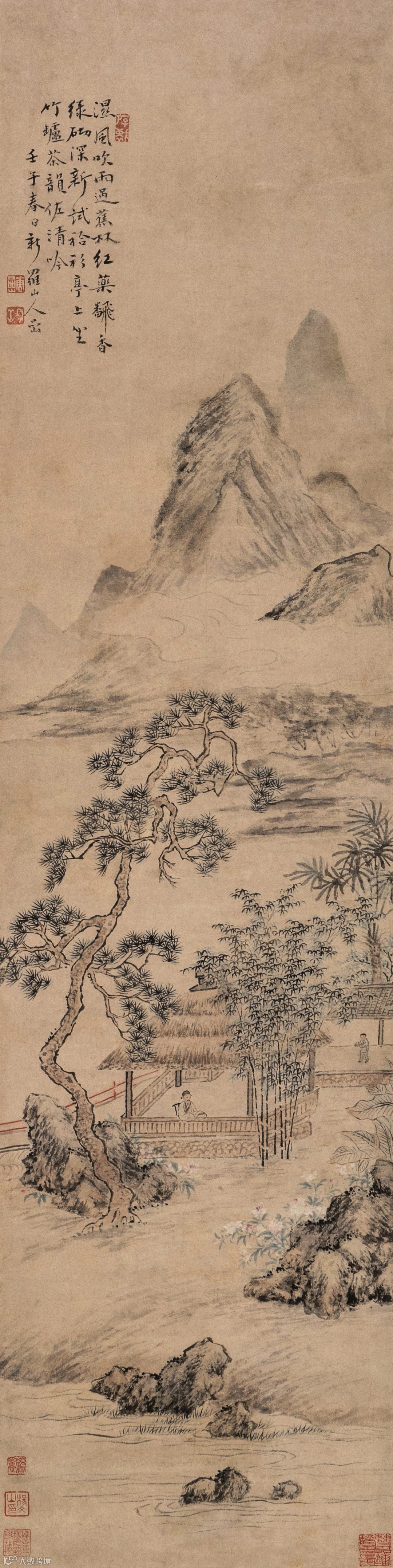 款识:湿风吹雨过蕉林,红叶飜香绿砌深。新试袷衫亭上坐,竹垆茶韵佐清吟。壬子春日,新罗山人喦。