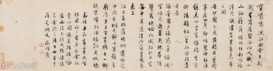 钤印:石田(白文)、启南(朱文)、白石翁(白文)、曾经我眼即我有(朱文)、两峰审定(朱文)、扬州阮氏琅嬛仙馆珍藏金石书画之印(白文)、海盐张元济经收(朱文)、毕泷涧飞藏印(朱文)、内阁学士内阁侍读学士翰林侍读学士(白文)、覃溪(朱文)、翁方纲印(白文)、覃溪鉴藏(朱文)、竹垞真赏(朱文)、兰卿珍赏(朱文)、集翠轩(白文)