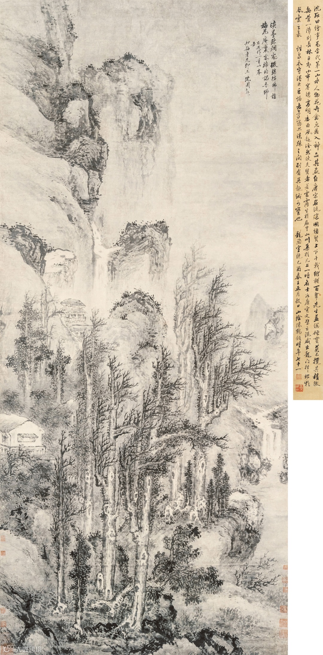 题跋:沈石田绘事为当代第一,山水人物花卉禽鱼悉入神品,其画自唐宋名流,胜国诸贤,上下千载,纵横百辈。先生兼总条贯,莫不揽其精微,每营一障则长林巨壑,小市寒墟,高明委曲,风趣洽然,使夫览者若云雾生于屋中,山川集于几上。一时名士,如唐寅、文璧云流咸出,龙门往往致于风云之表。性泉太守得此一巨幅,老笔密思,淡疏之间,别有异趣,诚可宝也。龙飞宣统己酉春王正月谷日,山阴陈鶤题,时年七十一。