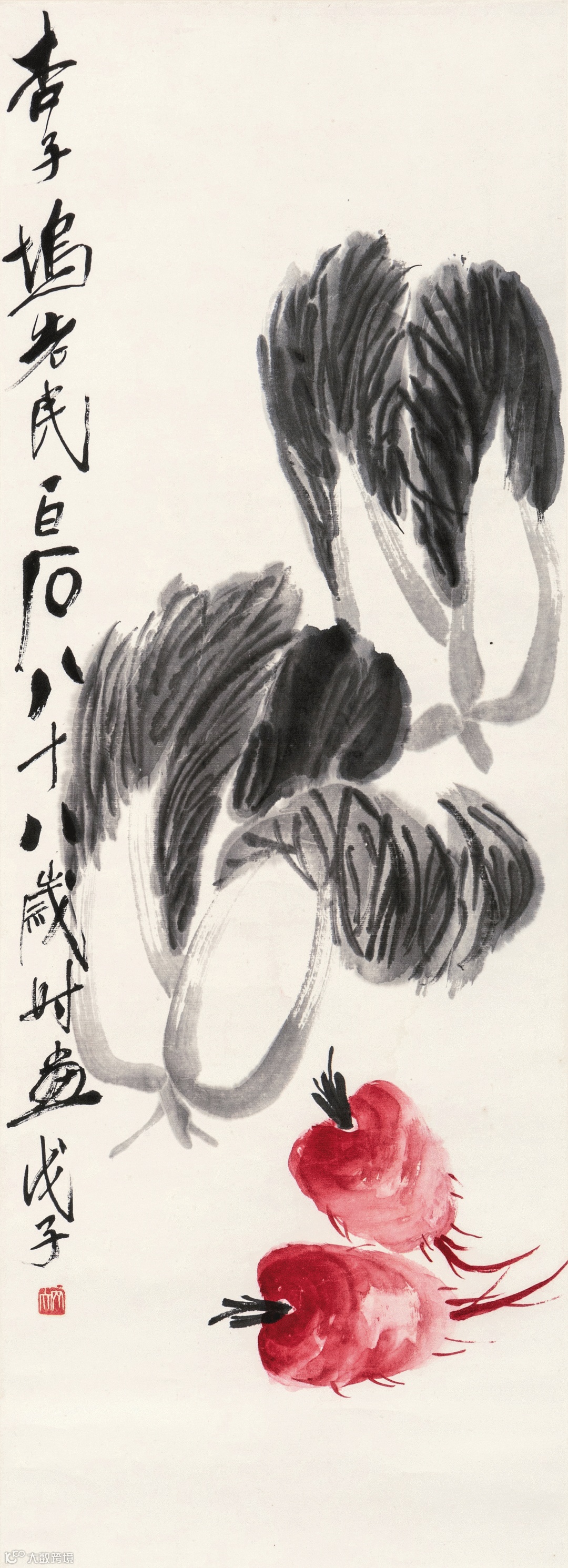 款识:杏子坞老民白石八十八岁时画,戊子。