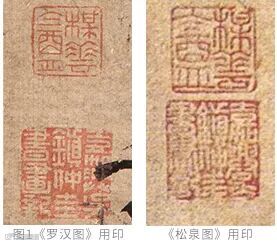 吴镇这幅画的两方印朱文方印“楳花盦”,白文方印为“嘉兴吴镇仲圭书画记”与其传世画作所用之印布局刀法均无二致,唯笔画略有差异。如与南京博物院藏吴镇《松泉图》用印比较。(图1)