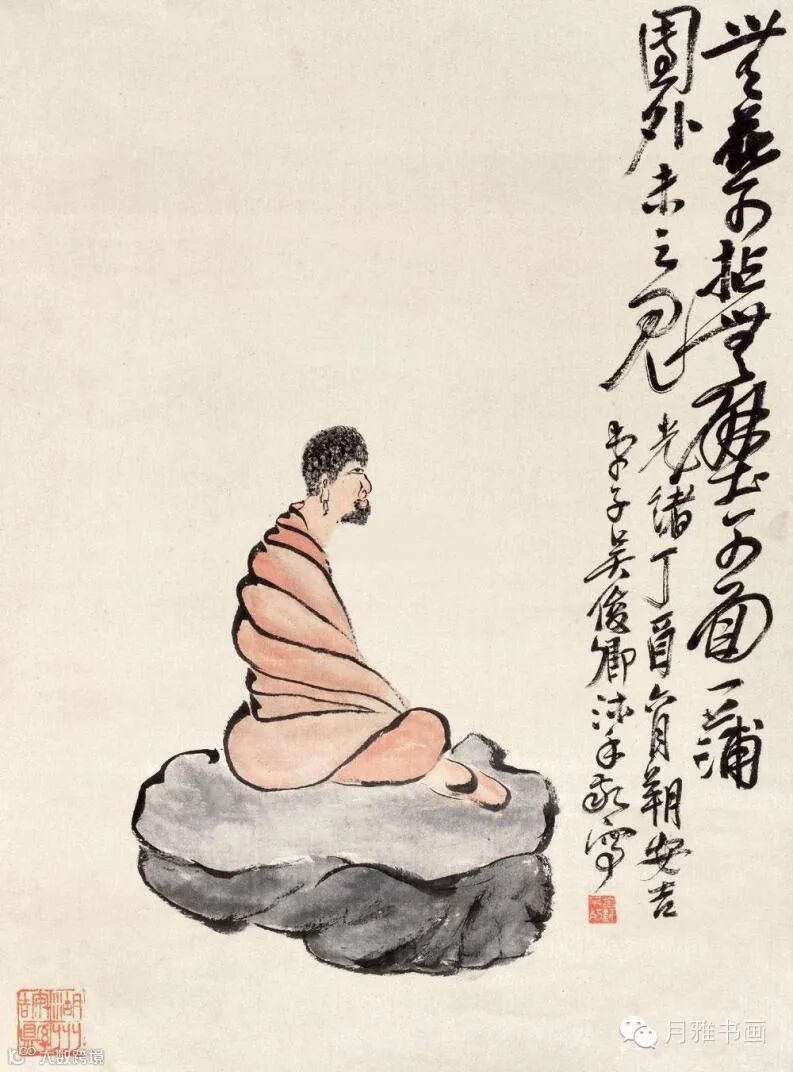 最令人称奇的是晚清大家吴昌硕也画过一幅与吴镇《罗汉图》颇为神似的罗汉像(图7),倘若吴昌硕先生没见过吴镇的《罗汉图》,只怕很难构思出如此酷肖的人物形象。