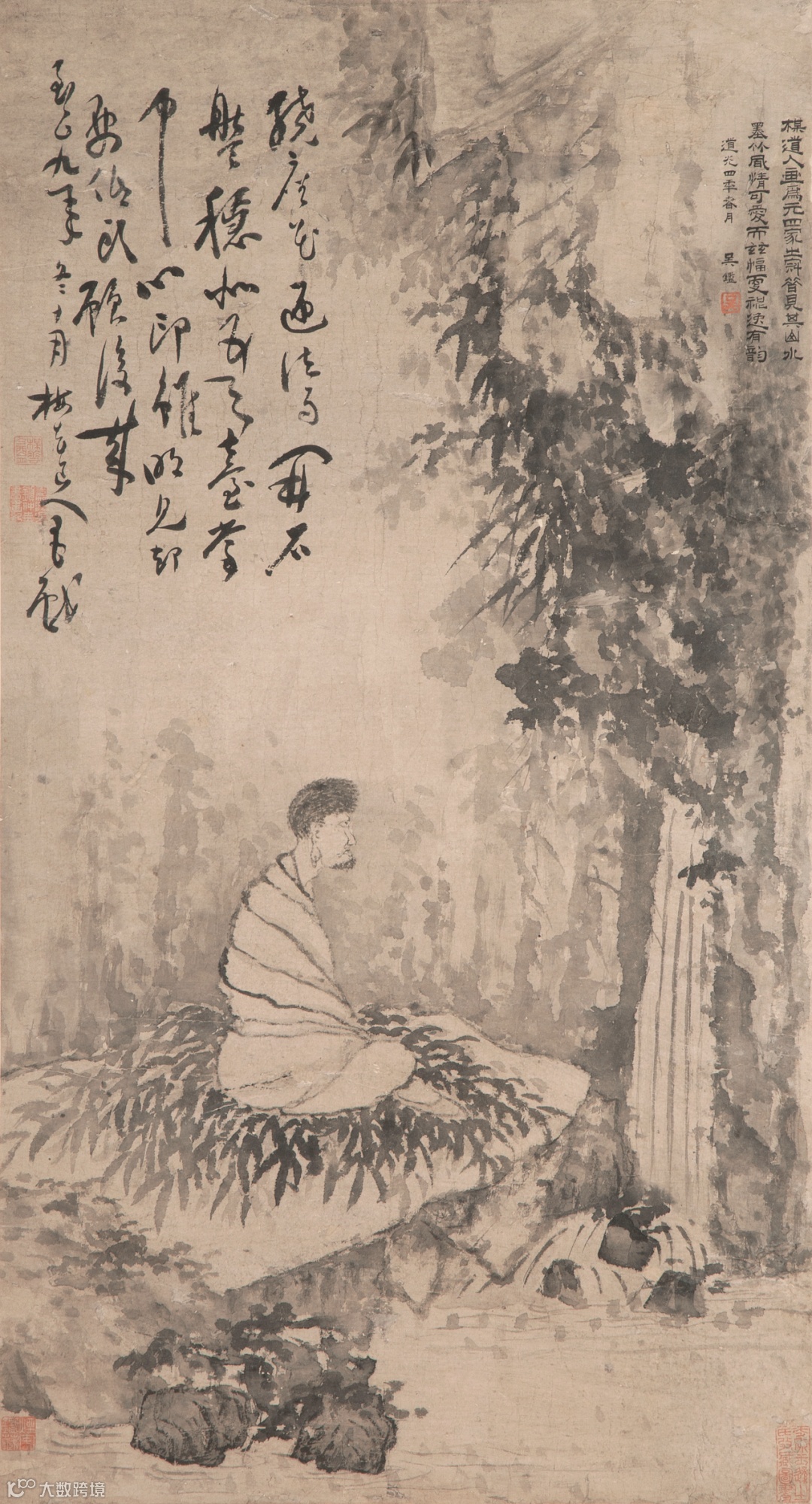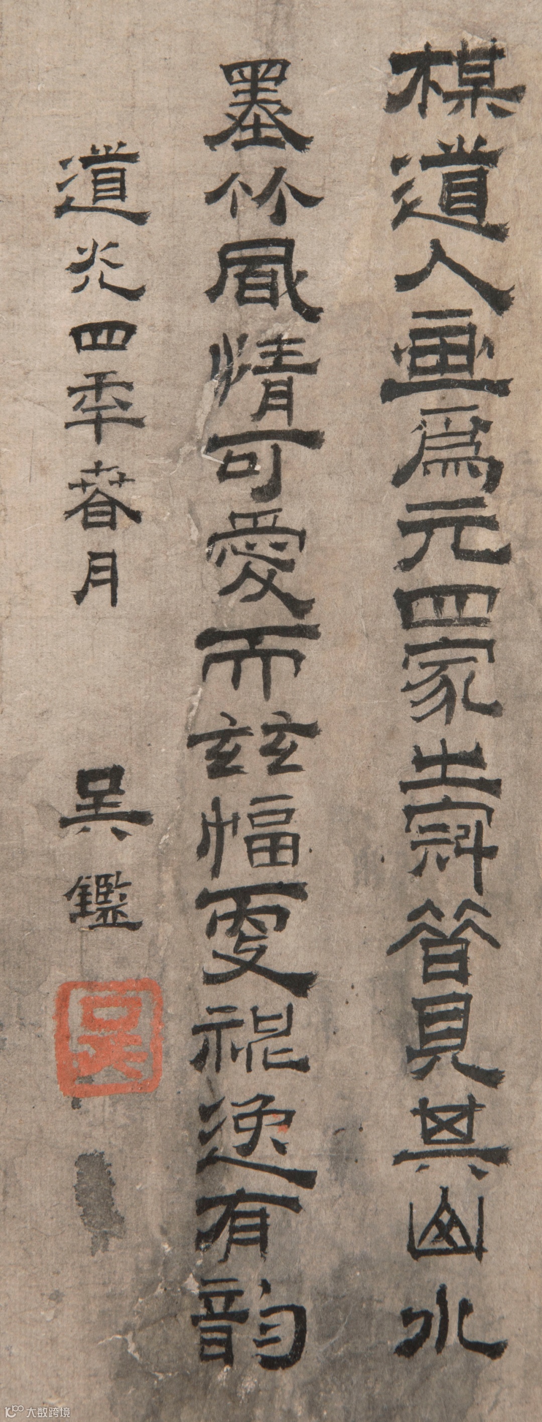 鉴赏题跋者吴鑑(1781-1837),湖州双林镇人,字献堂,号霁岚,太学生,诰赠奉政大夫,晋升中议大夫。他应曾是这幅画众多收藏者之一,其隶书有金农“漆书”遗韵,应与扬州八怪颇有渊源。