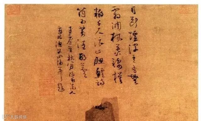 然而罗聘毕竟是临作,所以略显拘谨,无论是画面上的山僧坐姿、磐石坐垫、苍岩翠璧、溪流巨石,还是题诗行款气韵,均不如吴镇的原作生动活泼、疏朗洒脱。比如:山僧坐姿弓腰过甚,神韵不足,顶发过黑,缺乏立体感;磐石坐垫聚拢局促,不够舒展;苍岩翠璧整体显得僵化生硬;溪流狭小,水中石块显不出跌宕的落差。其用墨也略显浓重。至于题诗,行款笔划虽已竭力仿真,但毕竟不是自家自由创作,难以挥洒自如。试比较“绕座”“开”“中”“顾”“来”“人”诸字,即可明见。