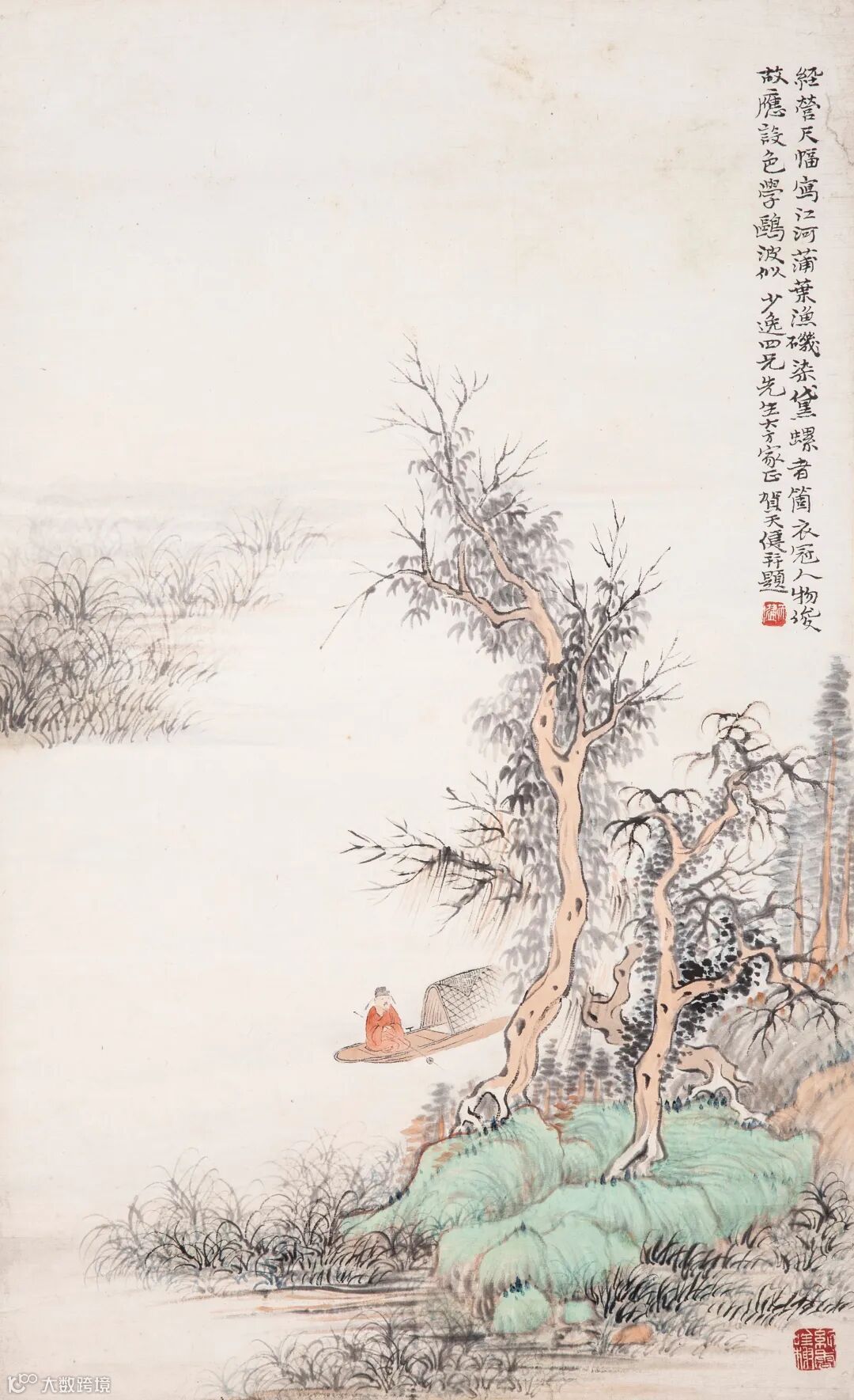 款识:经营尺幅写江河,蒲叶渔几染黛螺。者个衣冠人物俊,故应设色学鸥波。似少逸四兄先生大方家正,贺天健并题。