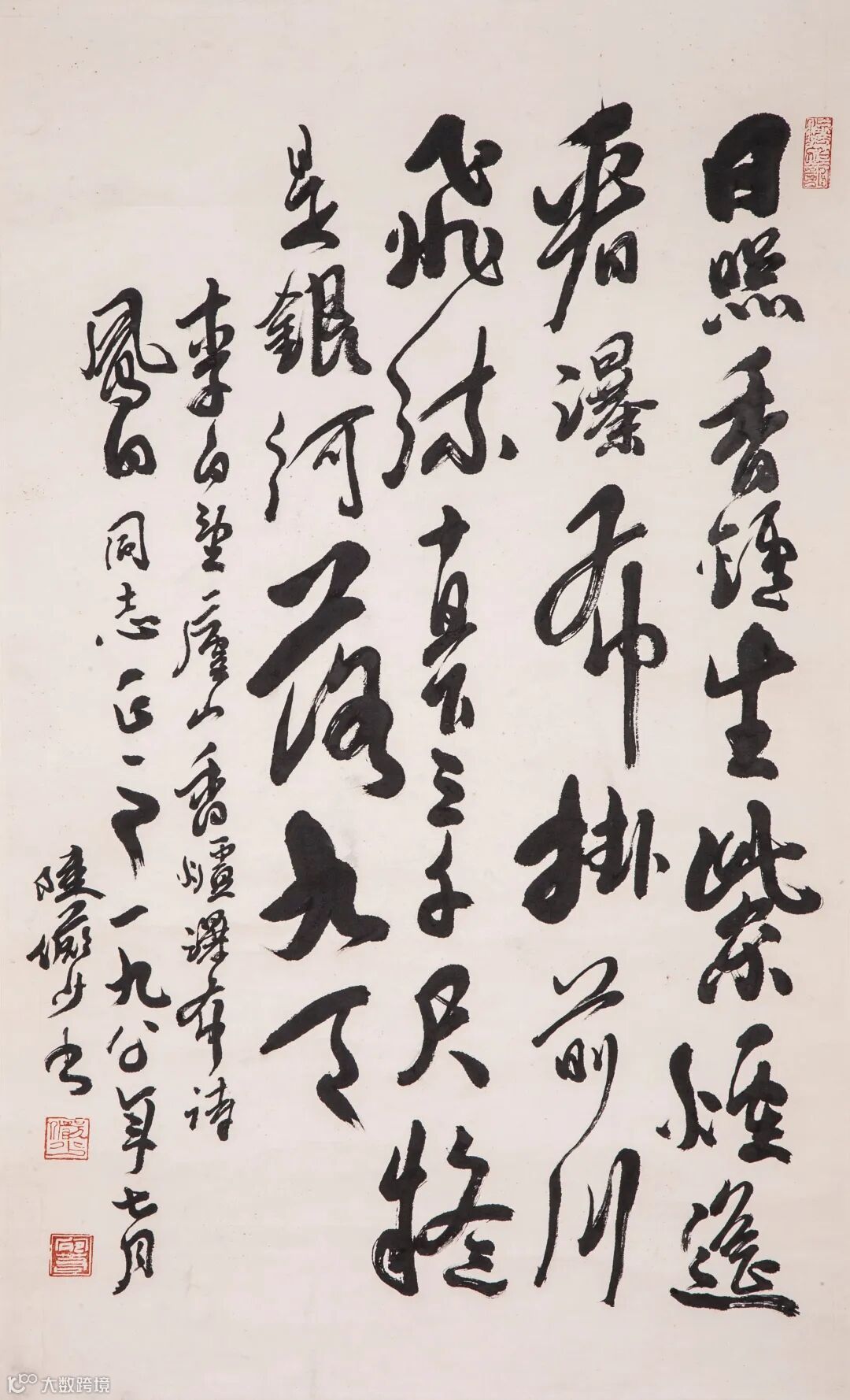 款识:李白《望庐山香炉瀑布》诗,风白同志正之,一九八〇年七月,陆俨少书。