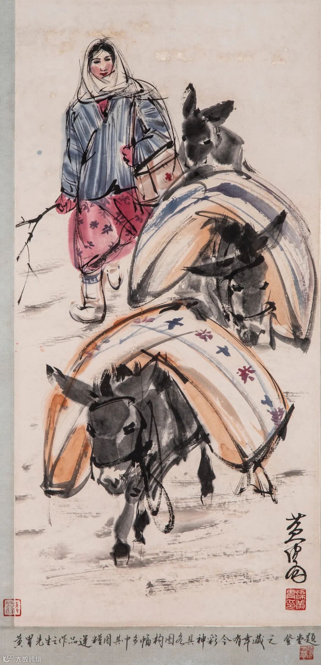 边跋:黄胄先生之作品运粮图,其中多幅构图,各具神彩。今有幸藏之。登堂题。