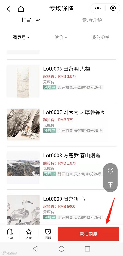 4.进入专场详情,下拉可查看专场拍品信息,点击【竞拍额度】
