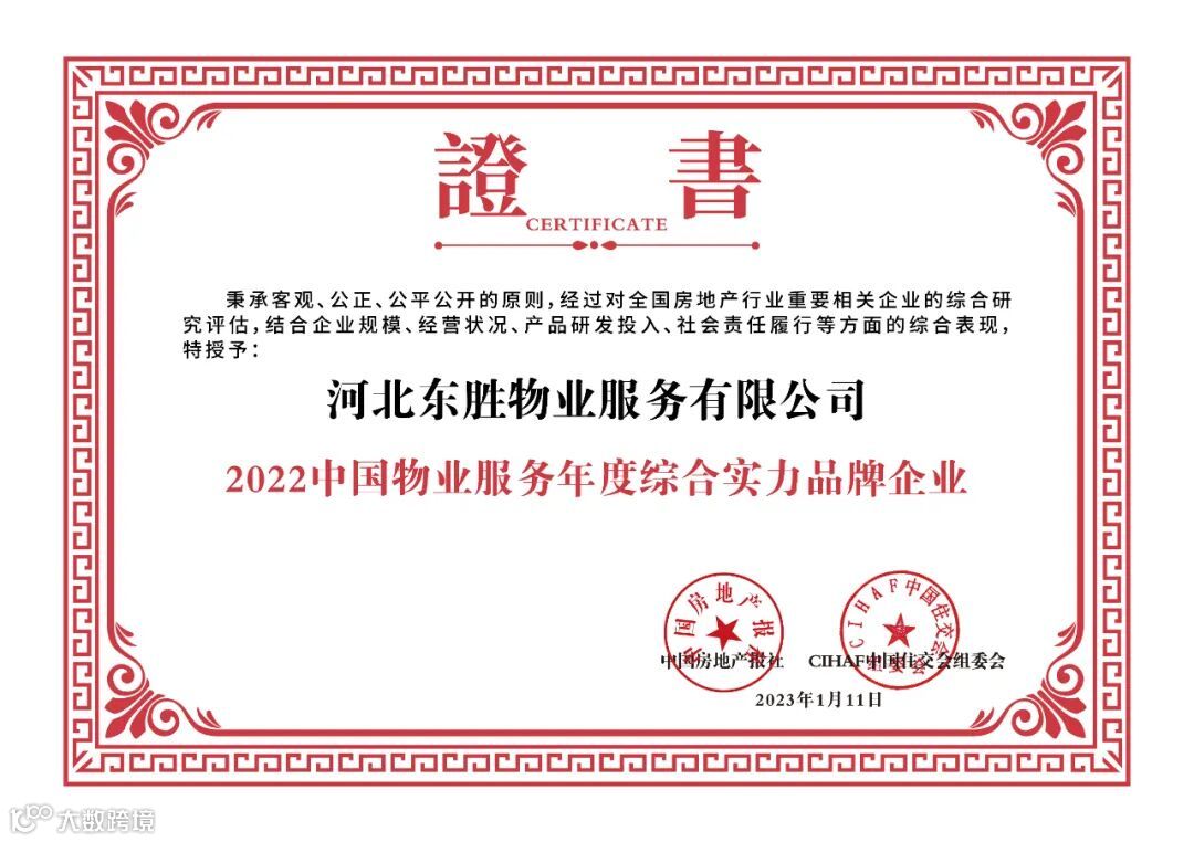 2022年东胜物业凭借稳健发展表现和综合实力等方面,屡获权威认可,荣获2022中国物业服务年度综合实力品牌企业、2022中国物业服务综合实力标杆企业、2022中国城市物业服务满意度优秀企业、2022中国五星级物业服务项目、冀房之星·金牌物业、2022年度河北省物业管理行业先进单位、抗击疫情突出贡献单位、冀房之星·暖心物业等荣誉,一份熠熠生辉的荣光亦是一个个闪亮起点。