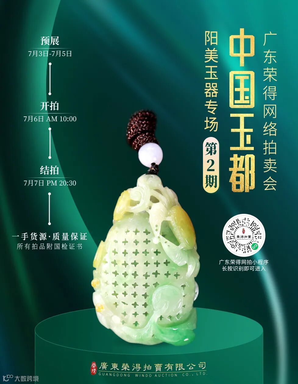 广东荣得拍卖有限公司「中国玉都 · 揭阳阳美玉器专场(第2期)」网络拍卖会将于7月6日早上10:00举槌。本场拍卖荟萃30多件翡翠玉器,琳琅满目的拍品涵盖了晶莹剔透的翡翠以及玉雕大师的匠心之作。