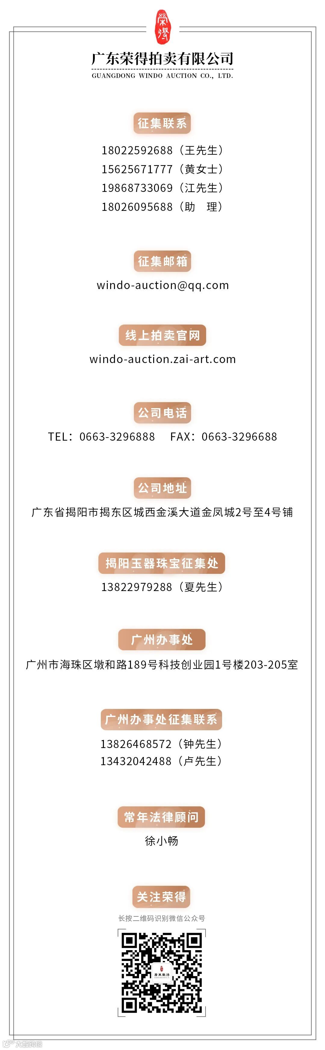 ● 广东荣得拍卖提供预约鉴赏服务。鉴赏地点:广东省揭阳市揭东区曲溪镇金溪大道金凤城2-4号铺广东荣得拍卖有限公司。鉴赏联系:15625671777。