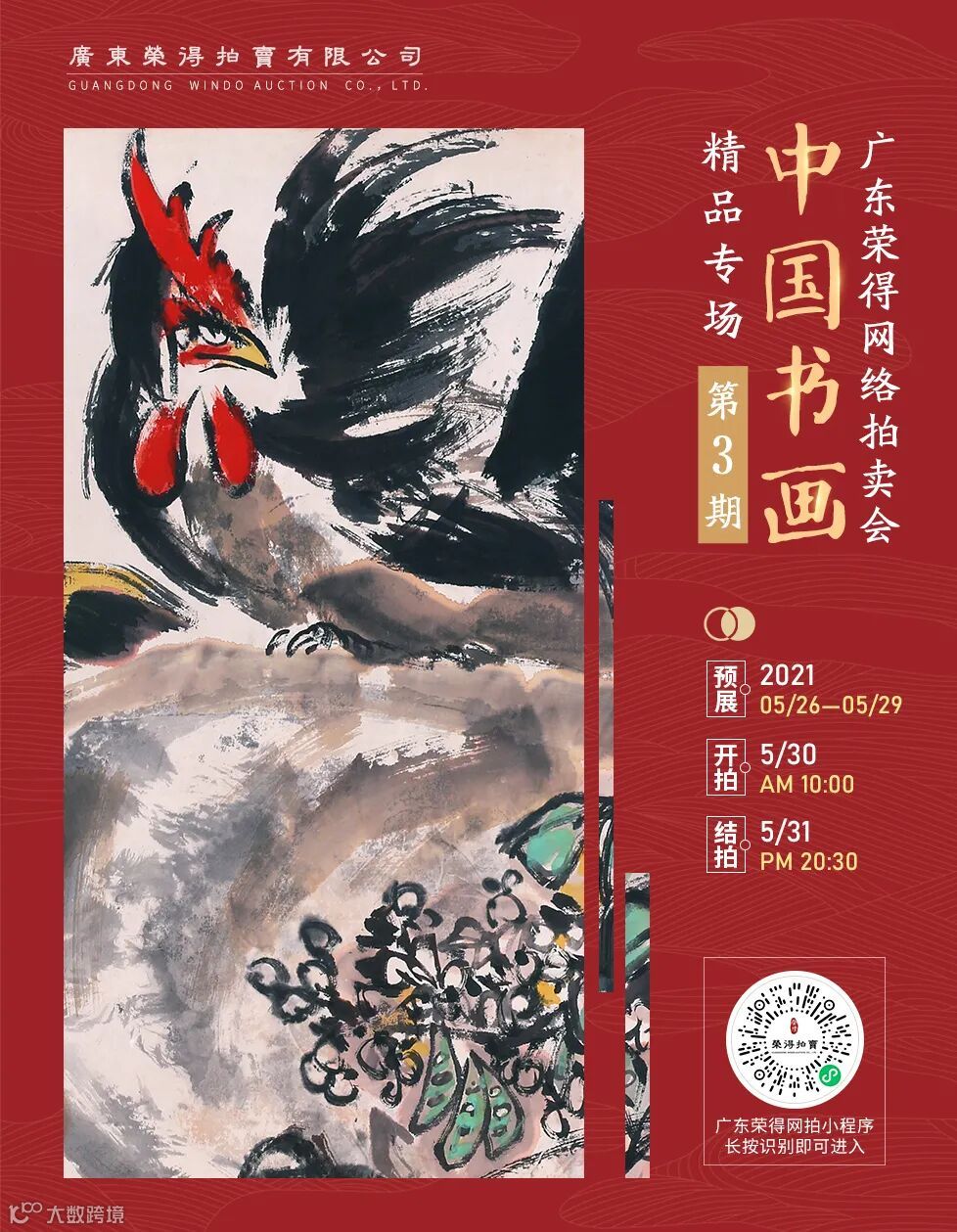 广东荣得拍卖有限公司《中国书画精品专场 · 第3期》网络拍卖会将于5月30日上午10:00举槌。本次拍卖仍以中国书画领衔,精心遴选共计31件拍品,王茂飞、陈大羽、林曦明、杜滋龄等名家佳构均有呈现。诚邀广大藏友徜徉艺海,莅临赏鉴。