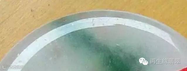 (2)朦胧光学效应:经溶蚀之后的翡翠矿物颗粒边界模糊不清,降低中粗粒结构翡翠的颗粒感,同时由于暗色物质被溶解带出,使得翡翠种水、地张及颜色得以改善。反光率降低、翠性减弱,总体翡翠显得股陇不清,呈半透明状。