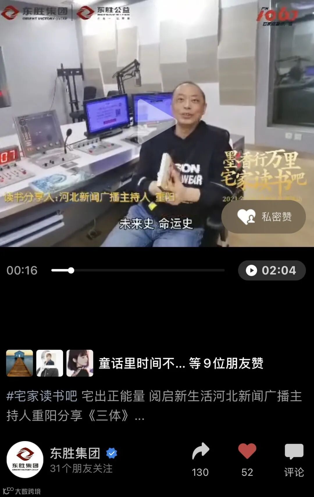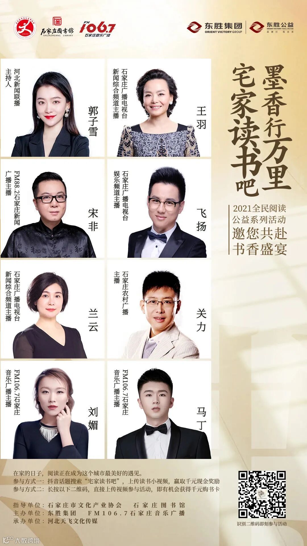 在2021年初疫情突袭背景下,为丰富市民居家文化生活,缓解特殊时期下的公众焦虑,东胜集团紧扣“倡导全民阅读,建设书香社会”的国家战略,联合石家庄音乐广播开展“墨香行万里宅家读书吧——2021全民阅读公益活动”,在为期3个多月的活动中,通过“美好领读人”荐书、云上读书会、线上读书视频打卡、线下读书分享会等丰富多彩的活动形式,以书为媒,吸引了社会大众的热情参与。
