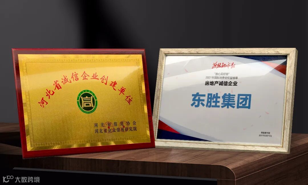 2021年3月15日,在第39个“3·15国际消费者权益日”到来之际,东胜集团荣获河北省企业信用协会、河北省企业信用研究院颁发的“河北省守合同重信用企业”(2020年度)、“河北省诚信企业创建单位”以及燕赵都市报“放心买好房”2021年国际消费者权益榜单“房地产诚信企业”称号。