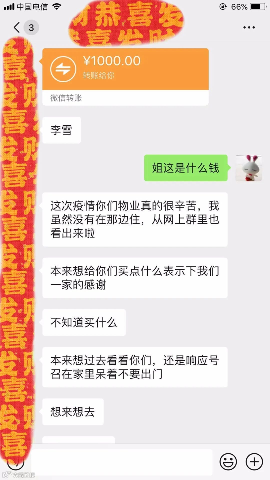 现实中我们以微笑示意,微信上我们以文字传递关爱。紫御府弘苑的业主将爱心款转给管家,感谢物业疫情期间的关怀,而我们更想道一声感谢,比钱更重的是您的心意,对物业工作的每一份支持和理解。