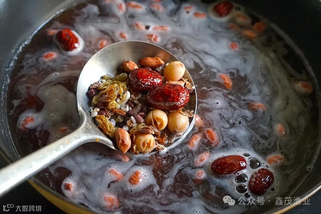 - 当米粒开花、红豆软烂时,加入花生和红枣继续熬煮片刻。
