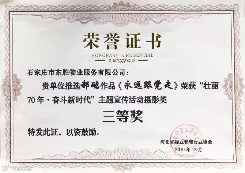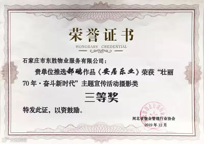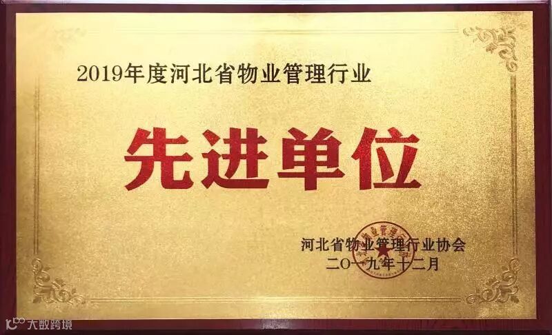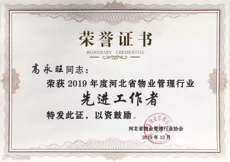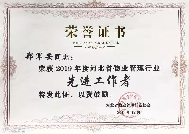 荣获2019年度河北省物业管理行业 “先进工作者”称号