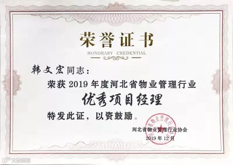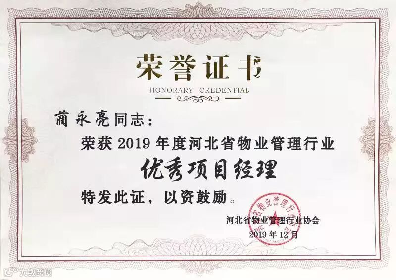 荣获2019年度河北省物业管理行业 “优秀项目经理”称号