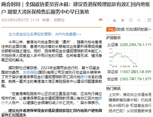 容永祺表示,在2018年提出的关于在粤港澳大湾区建立香港寿险服务中心的提案中便已指出:“期满的现金和赔偿金不能存入内地银行账户,会令内地资金不能回流,成为国家的外汇损失。”