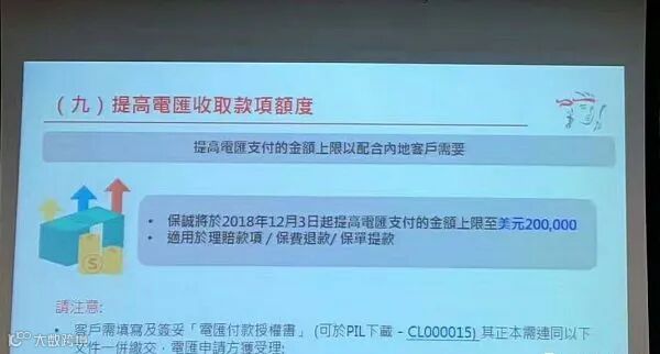 为更配合内地客户的需要,从2017年下半年起,一些香港保险公司,新增“内地客户以电汇收取款项”的支付方式。包括保诚、友邦在内的各大保险公司都已经支持理赔款转账到内地指定银行账户。