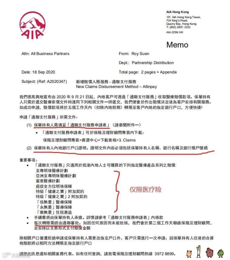 由2020年9月21日起,内地客户可透过「通联支付服务」收取医疗赔偿款项。