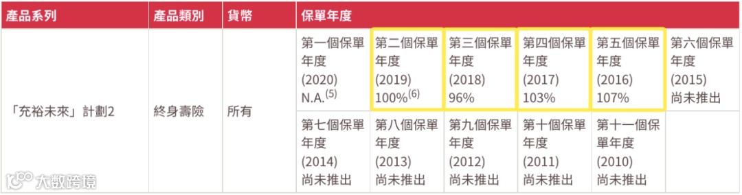 2016年推出。2016-2019年投保的「充裕未来2」,总现金价值比率分别为107%、103%、96%、100%。