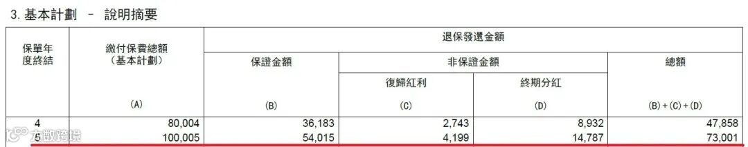 这行下面,就是下一个保单周年,也就是第5个保单周年日(2024年5月到达),保险公司预期可以给到的退保价值,金额是73001美元。这个金额是根据去年(2022年)友邦的分红报告,由精算部计算出来给客户演示的。