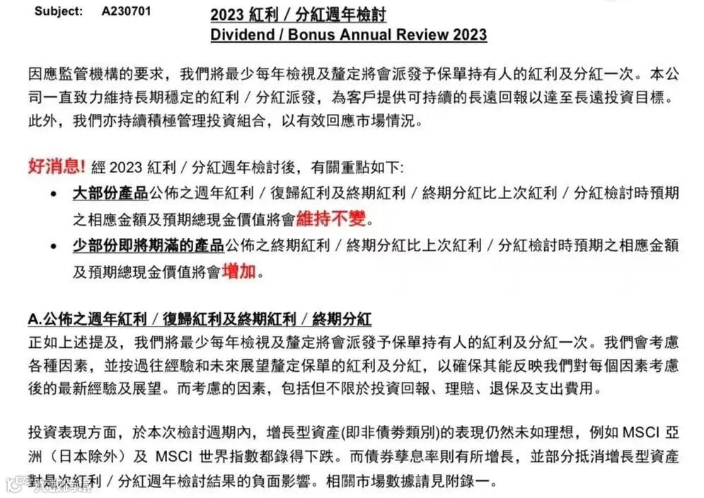 那香港保险公司也不例外,很多在公布分红报告时,给投资人打了预防针,未来可能会下调分红,不过让人意外的是,前段时间友邦宣布2023年8月后到达周年日的保单,分红和去年预期的一致,甚至调高一些产品的分红!