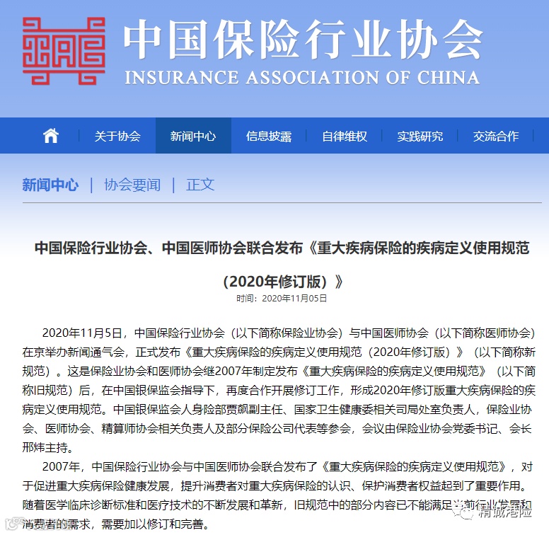 2020年11月5日,中国保险行业协会与中国医师协会正式发布了《重大疾病保险的疾病定义使用规范(2020年修订版)》。新规要求内地保险公司必须于2021年的2月1日起销售符合新定义的重疾险。