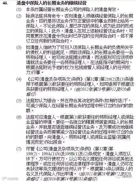 《香港保险公司条例》中第46条(2)规定:“除非法庭另有命令,否则清盘人须继续经营保险人的长期业务,目的是将该业务作为正营运中的事业而转让给另一保险人,不论此保险人是已存在的保险人或为此目的而成立的保险人;