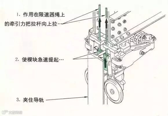 是在限速器的操纵下,当电梯速度超过电梯限速器设定的限制速度,或在悬挂绳发生断裂和松弛的情况下,将轿厢紧急制停并夹持在导轨上的一种安全装置。