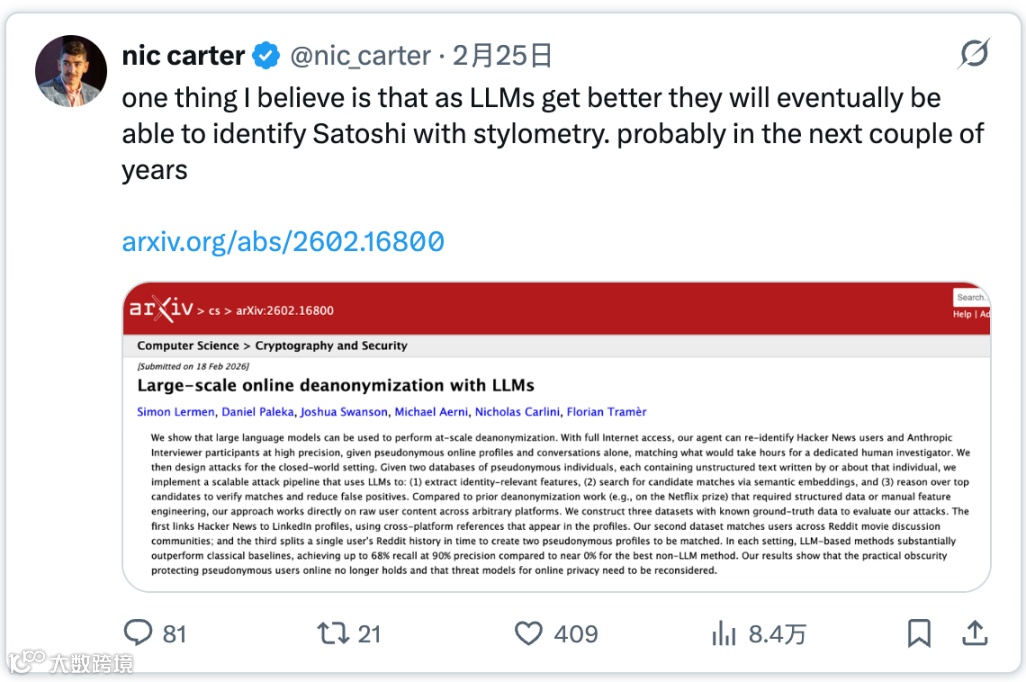 我相信,随着大语言模型不断进步,它们终将通过文体计量学识别出中本聪,这很可能在未来几年内实现。