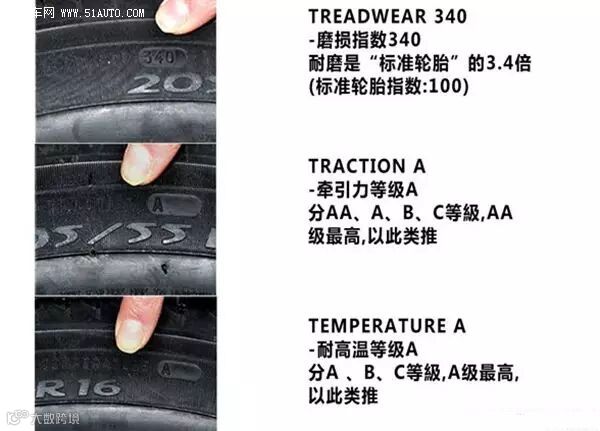Treadwear耐磨指数以数字来表示,数字的高低代表了轮胎在相同使用环境下可行驶里程的多少,数字越大,可以理解为该款轮胎更加耐磨。这里就涉及到了一个鱼和熊掌不可兼得的问题,通常抓地性能出色的轮胎耐磨指数却比较低,这就是为什么通常高性能轮胎的耐磨指数都在200以下,而一般在300以上的轮胎虽然耐磨,但是民用、舒适的定位让它的抓地性能要逊色于那些竞技、运动定位的高性能轮胎。