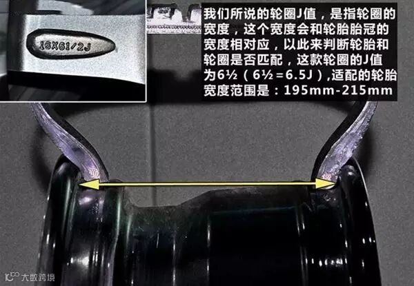 前面提到了轮胎的胎宽,很多车主在升级轮胎的同时还会升级轮圈,这里就涉及到了另一个和轮胎宽度数值对应的数值,轮圈J值。我们通常说轮圈的宽度是7J、8J,这里的数字代表的就是轮圈横截面内径的宽度,也可以理解为是轮圈的宽度值,它和轮胎宽度值是互相匹配的,字母则是代表轮圈凸缘的形状和高度,升级轮圈的朋友一定要了解这两个数值间的对应关系。