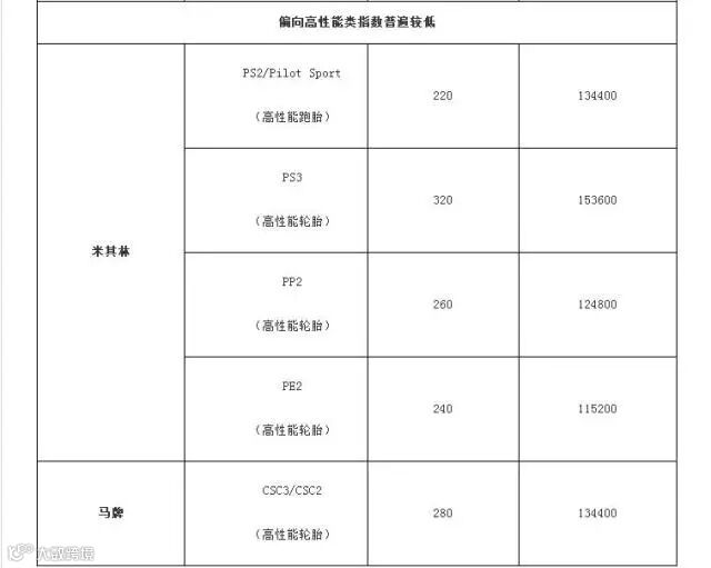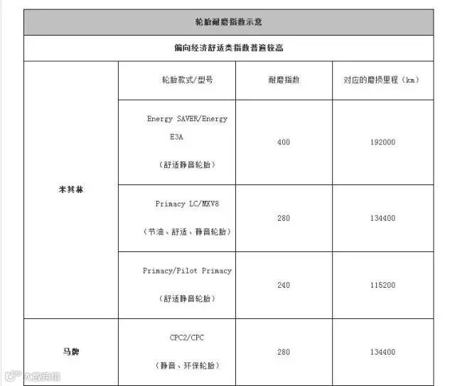 ●若仔细观察各知名厂牌轮胎的耐磨指数,其实会发现都有一个逻辑存在,请看下表: