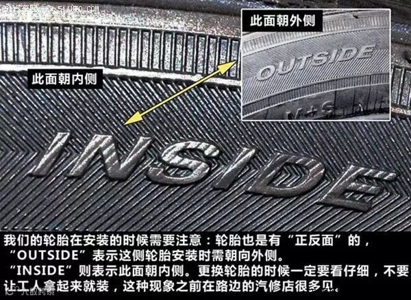 除了常见的有单导向花纹的轮胎,胎侧有指示箭头,安装后胎侧的箭头应与车辆的行驶方向一致外,还有非对称花纹的轮胎,胎侧标有“OUTSIDE”,安装后该标识应在外侧,如发现轮胎安装错误,应及时纠正,否则会导致两侧车轮的抓地力不同,尤其在湿滑道路上,导致车辆的制动力不同步、操控性不好、跑偏等,极端情况时,会影响行车安全。