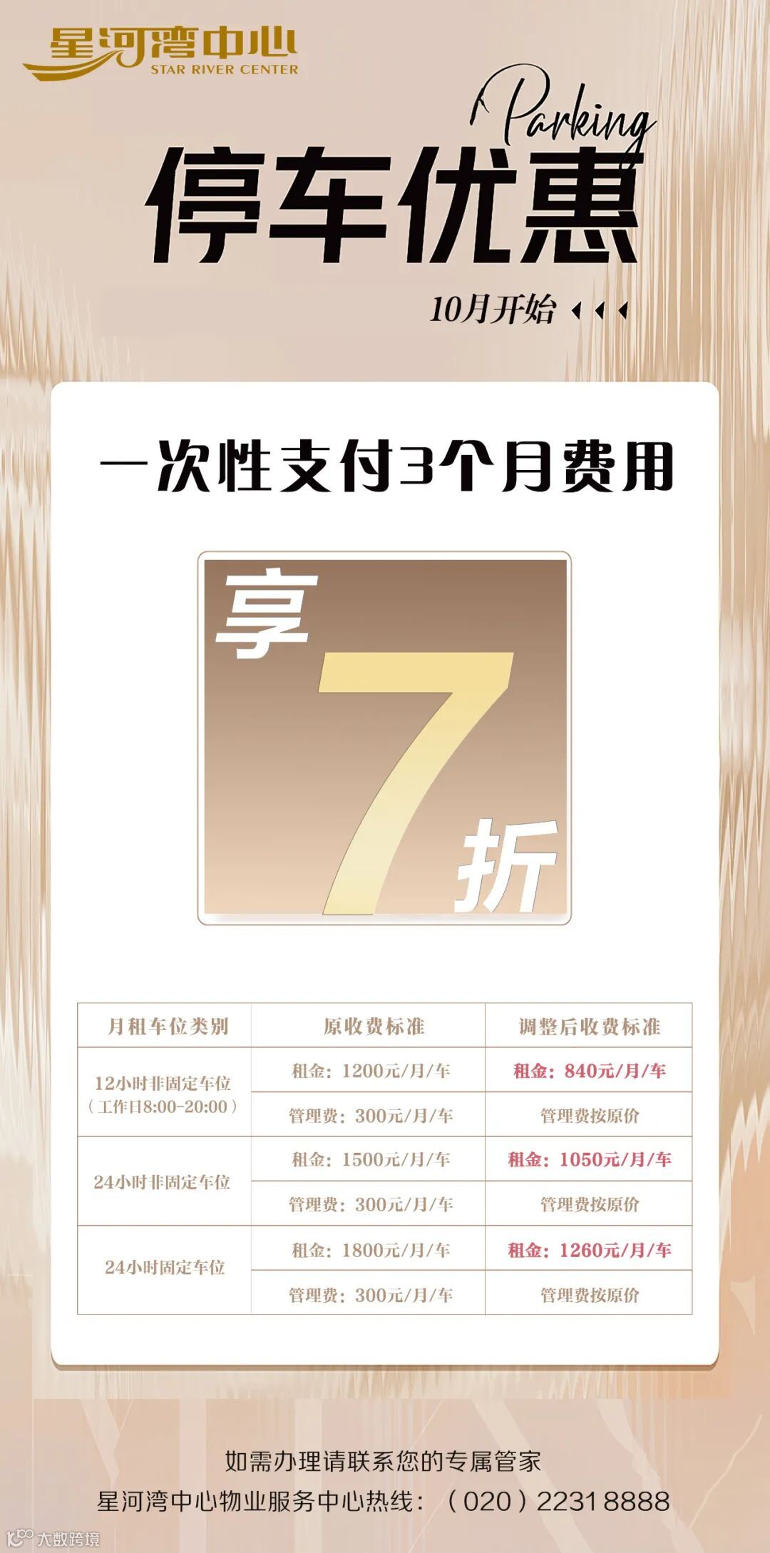 感恩租户一直以来对星河湾中心的支持和信任,我们面向全体租户重磅推出: “季度支付享月租7折” 的月租优惠;另外,已办理月租车位的租户,同时可享受本次优惠政策;让大家能以更丰厚的福利、更灵活的权益,轻松享受 “尊贵不高价,便捷更省心” 的专属礼遇。