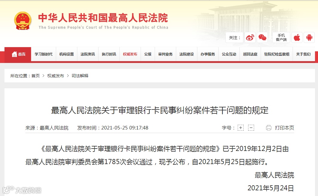 最高人民法院关于审理银行卡民事纠纷案件若干问题的规定25日起施行,其中明确规定: