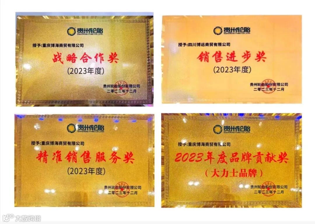 贵州轮胎股份有限公司董事长黄舸舸和总经理王鹍为32家优秀合作伙伴颁发战略合作奖,重庆博海商贸有限公司获此殊荣。此外,重庆博海商贸有限公司还荣获精准销售服务奖(2023年度),2023年度品牌贡献奖(大力士品牌);博海集团旗下四川博远商贸有限公司亦荣获销售进步奖(2023年度)。