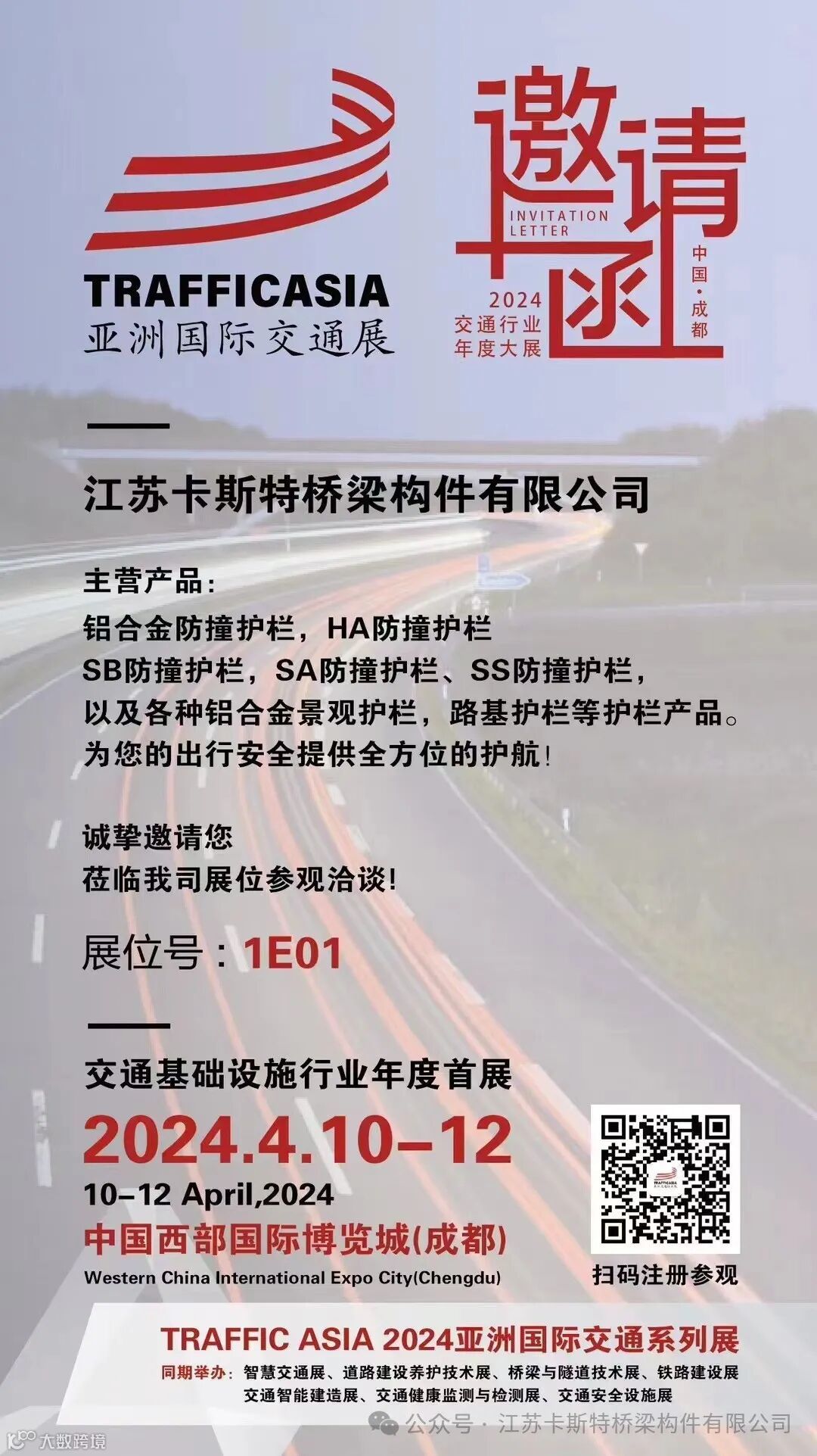 让我们一同探索未来城市交通的新趋势,共同倡导安全出行的理念。期待与您在2024亚洲国际交通技术与工程设施展览会上相会!卡斯特桥梁构件有限公司诚挚邀请您莅临展位,与我们深入交流,共同探索交通设施行业的无限可能!
