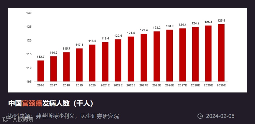 中国国家癌症防控中心曾公布,我国每年新增宫颈癌约11.6万人,死亡约3.7万,也就是说,每5分钟有一名女性确诊宫颈癌,而每9分钟有一名女性因宫颈癌离世。《弗若斯特沙利文》与民生证券研究院的联合报道中显示,截至到2030年,宫颈癌患病率呈持续增高并呈现年轻化趋势,患癌人数将超过百万。