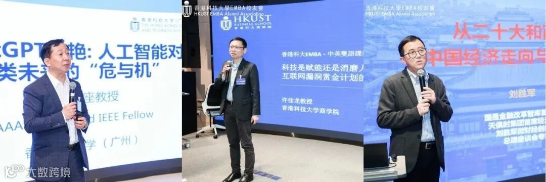 三天的活动,25日是核心重点。25日上午,曹志伟主席与熊伟国常务副主席组织校友们抵达香港科技大学(广州)校园,参与返校日课程。港科大商学院资深副院长许佳龙教授和港科大(广州)人工智能学域主任熊辉教授分别就《科技是赋能还是消磨人类的生产力?》、《ChatGPT 惊艳,人工智能对人类未来的“危与机”》等主题带来了最前沿的绝妙分享;下午,著名经济学家刘胜军对中国经济变化和中国新格局进行深度解构,为校友们带来了《后疫情时代,从两会看中国经济走向和全年投资机会》为题的精彩演讲,校友们纷纷表示课程收获满满、获益良多。白天的在校活动得到了香港科技大学(广州)校长倪明选教授的大力支持;香港科技大学商学院院长谭嘉因教授亦特地从香港赶来到场致贺。