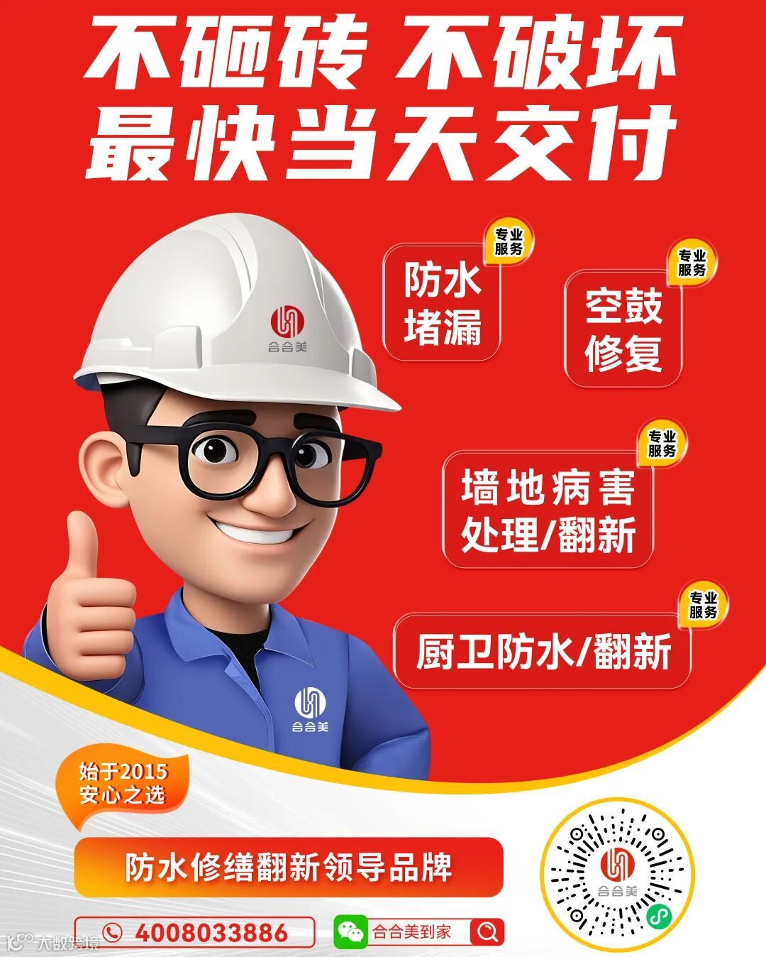 既有建筑的修缮维护领域充满着无限的机遇,合合美到家堵漏修缮维护平台也为建筑行业工人搭建了一个实现职业转型和发展的优质平台。建筑行业的同仁们,是时候抓住这一市场机遇,勇敢地迈向既有建筑修缮维护领域,开启属于自己的职业新篇章,在这个新的赛道上创造出属于自己的辉煌。