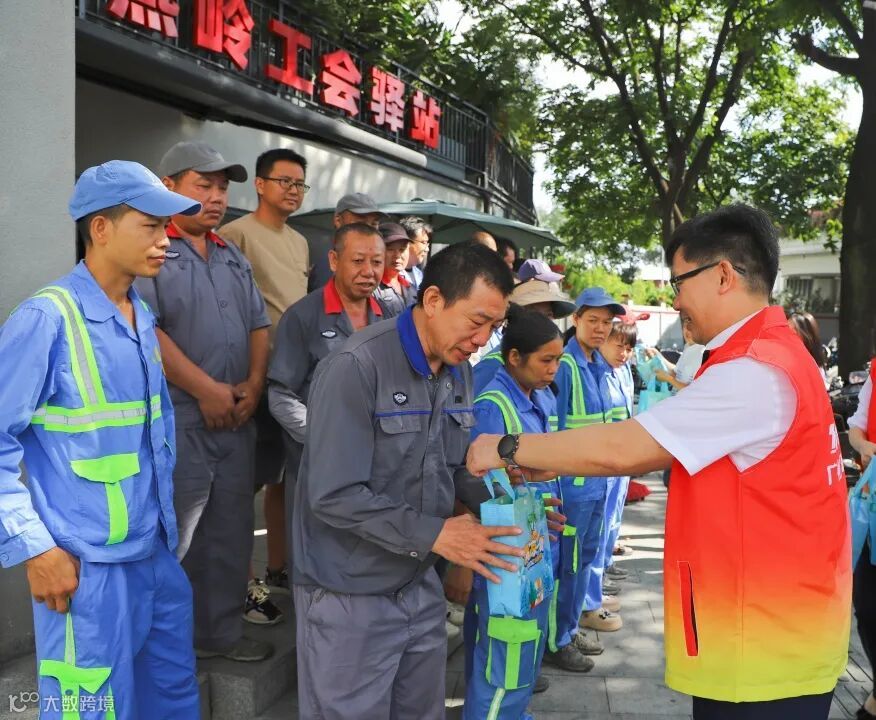 活动现场,志愿者们将一份份满载心意的“防暑降温慰问包”送到环卫工人手中,包内装有清凉饮料、防蚊花露水、毛巾等实用物资,为他们带去一丝夏日的清凉与诚挚的问候。