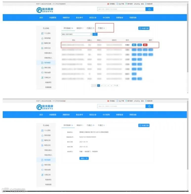 (2)房源信息和备案信息同时提交后,如果房源未审核通过,备案不会提交到房源所在街道进行审核。房源通过后,备案自动进行提交,无需重复提交。如房源不通过,则需在“我的房源”中点击修改,再次提交房源进行审核,修改的信息会自动同步备案信息。