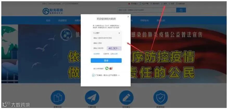 进入阳光租房首页后,点击右上角“登录”按钮,即可弹出登录信息填写窗口,公众用户登录方式包含:账号/手机号+密码登录、第三方(微信、微博)登录、广东省统一身份认证平台登录。