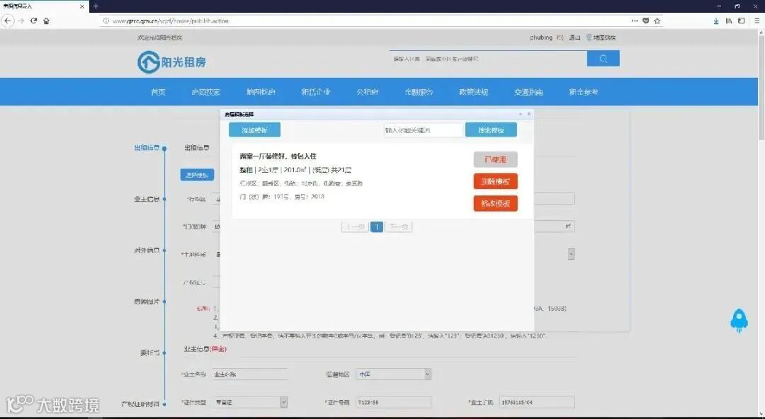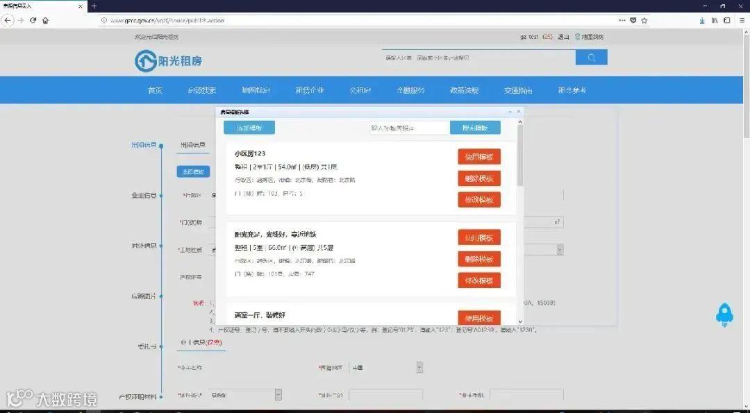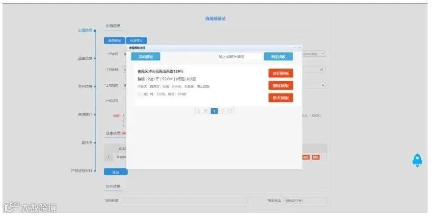 4、使用模板模板新建完成后,返回房源登记界面,再次点击选择模板,在弹出页面会列出所有已经录入的模板,点击”使用模板 ”按钮,数据会自动填入输入框内。选择模板后,按钮会显示”已使用 ”,可以修改或删除已录入的模板